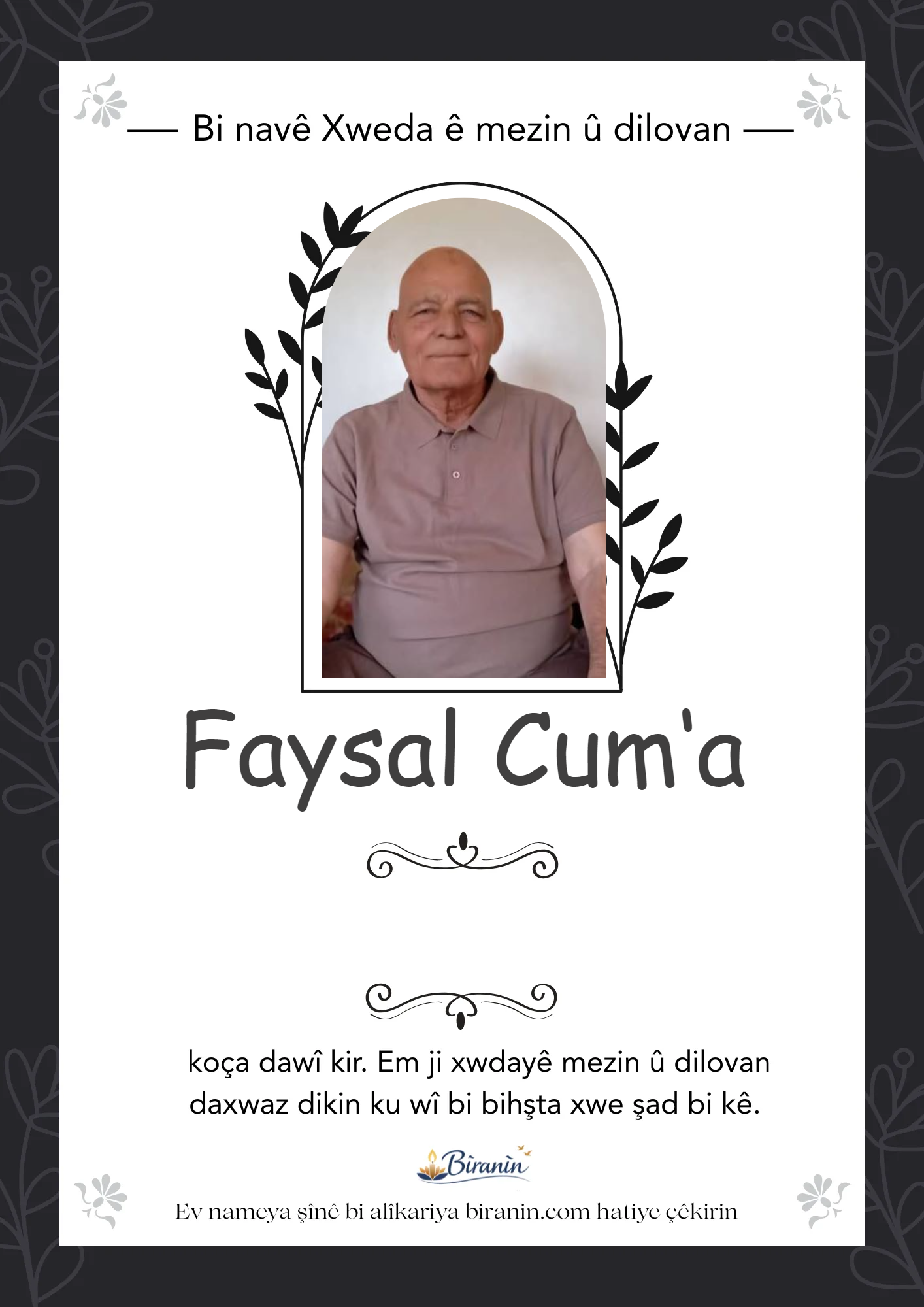 Bi dilekî pir xemgîn û bi êşeke mezin, me mîna mirina  Faysal Cum‘a (Ebû Cewan) bihîst.